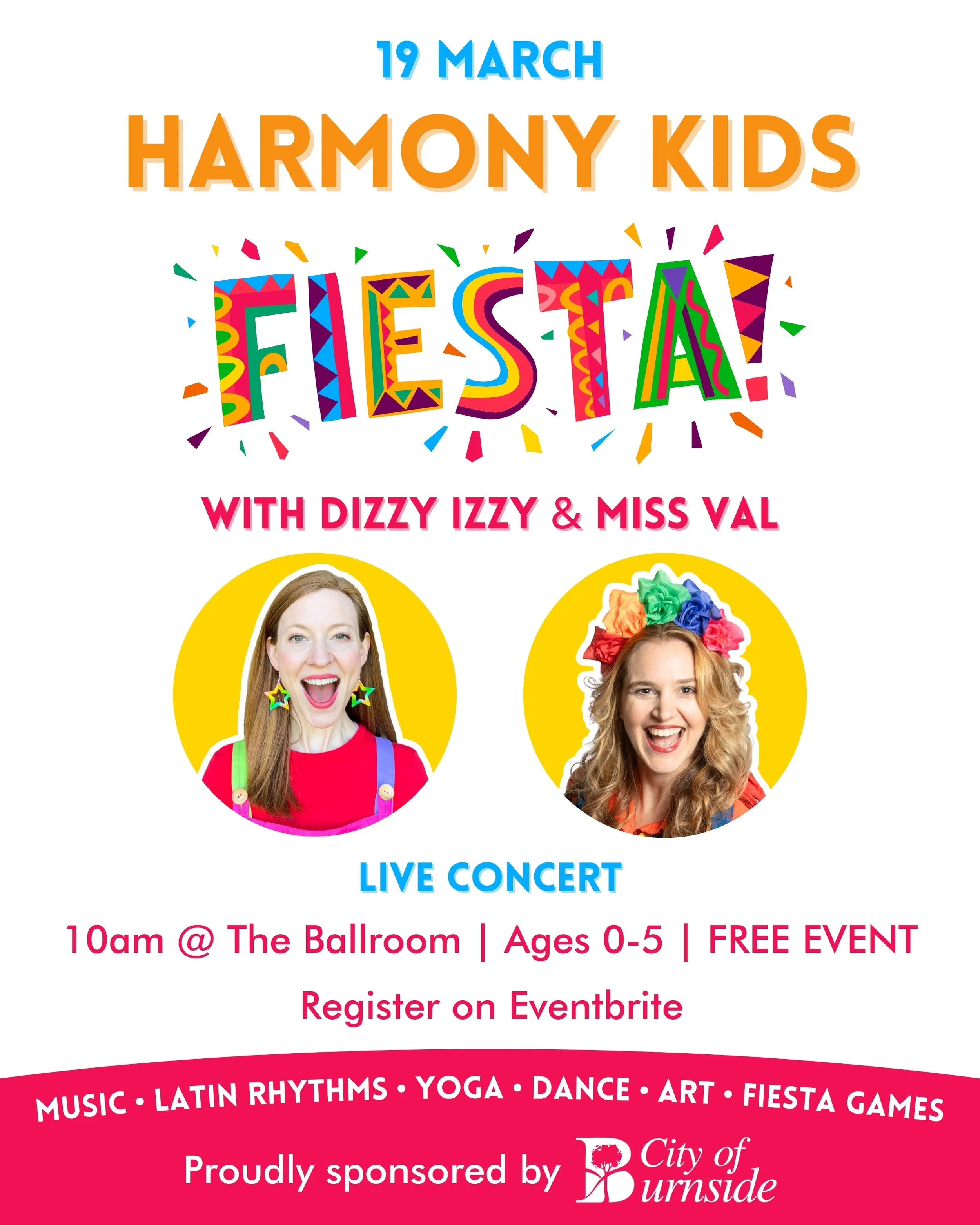A Harmony Week celebration of music, latin rhythms, yoga, dance, art and fiesta games. Ages 0-5